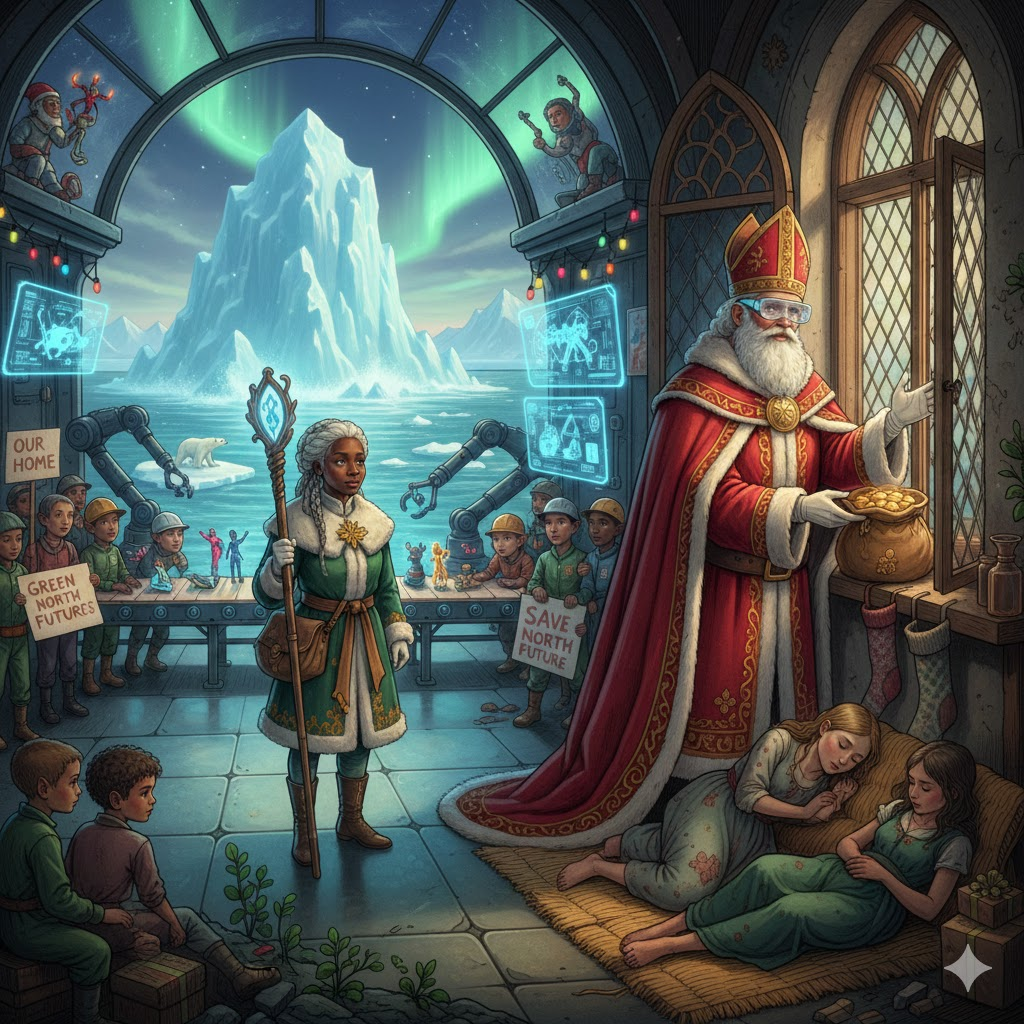 - 요정(엘프)의 노동: 장난감을 만드는 작은 엘프들을 도입하여, 산타의 대규모 선물 생산 능력을 설명했습니다.